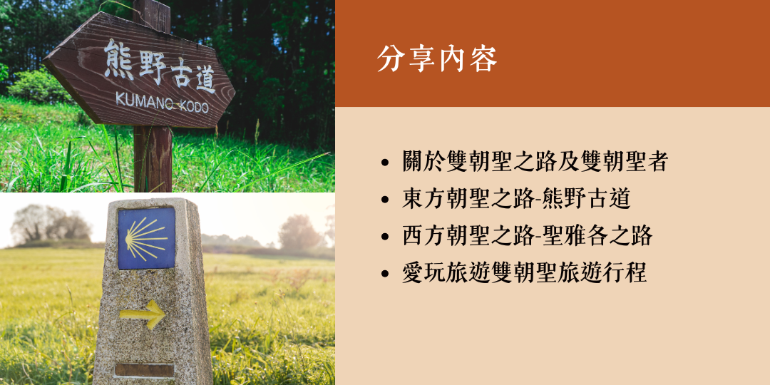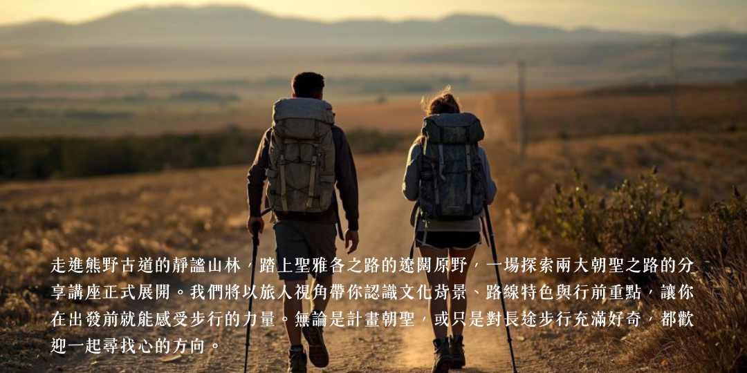 當兩條跨越千年的朝聖之路,在一場分享講座裡相遇,心靈的旅程便悄悄展開。這場特別企劃將帶領你走進日本熊野古道的靜謐山林,感受古老信仰在苔石間流動的溫度;也會踏上西班牙聖雅各之路的遼闊原野,聆聽來自世界旅人的腳步與故事。