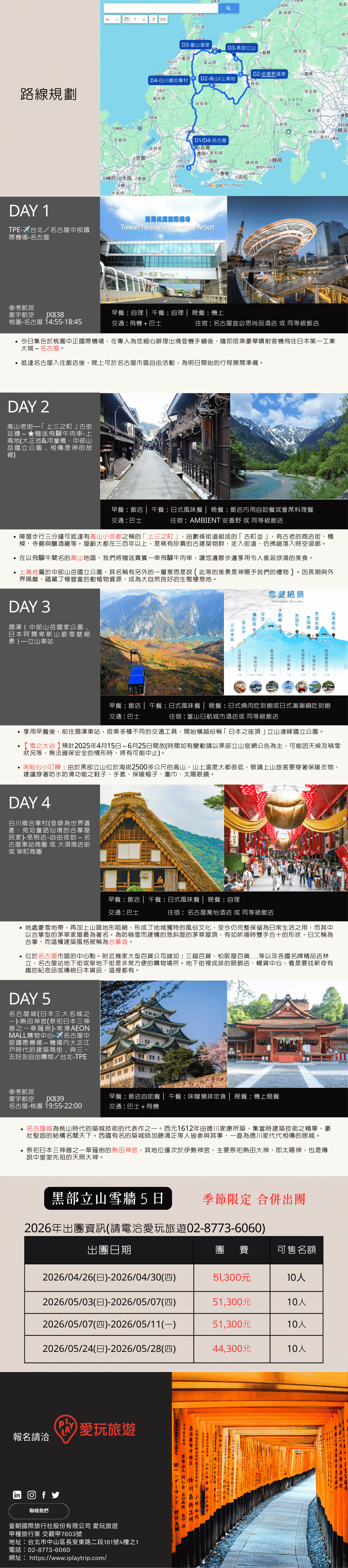 季節限定【經典名古屋.黑部立山雪牆5日】名古屋萬怡、白川鄉合掌村、上高地、熱田神宮