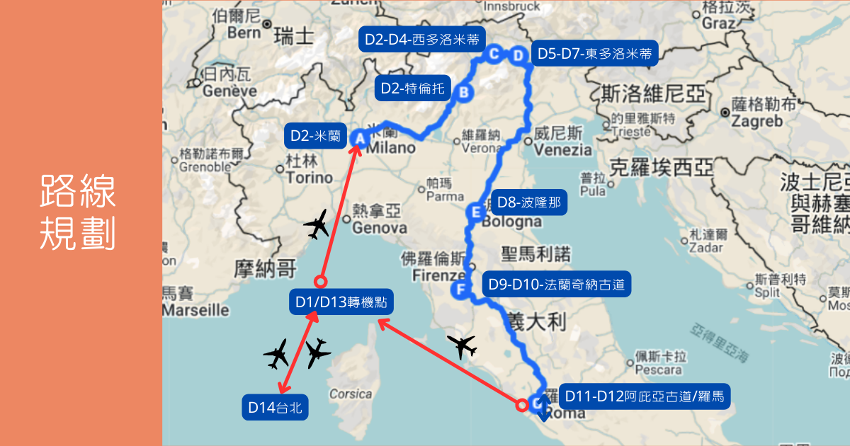 今日離開多洛米蒂山區,前往美食與文化之都波隆那(Bologna)。波隆那位於米蘭-佛羅倫斯-威尼斯三角地帶的中心,擁有豐富的歷史、藝術、美食、音樂、文化,2000年獲選為歐洲文化之都。